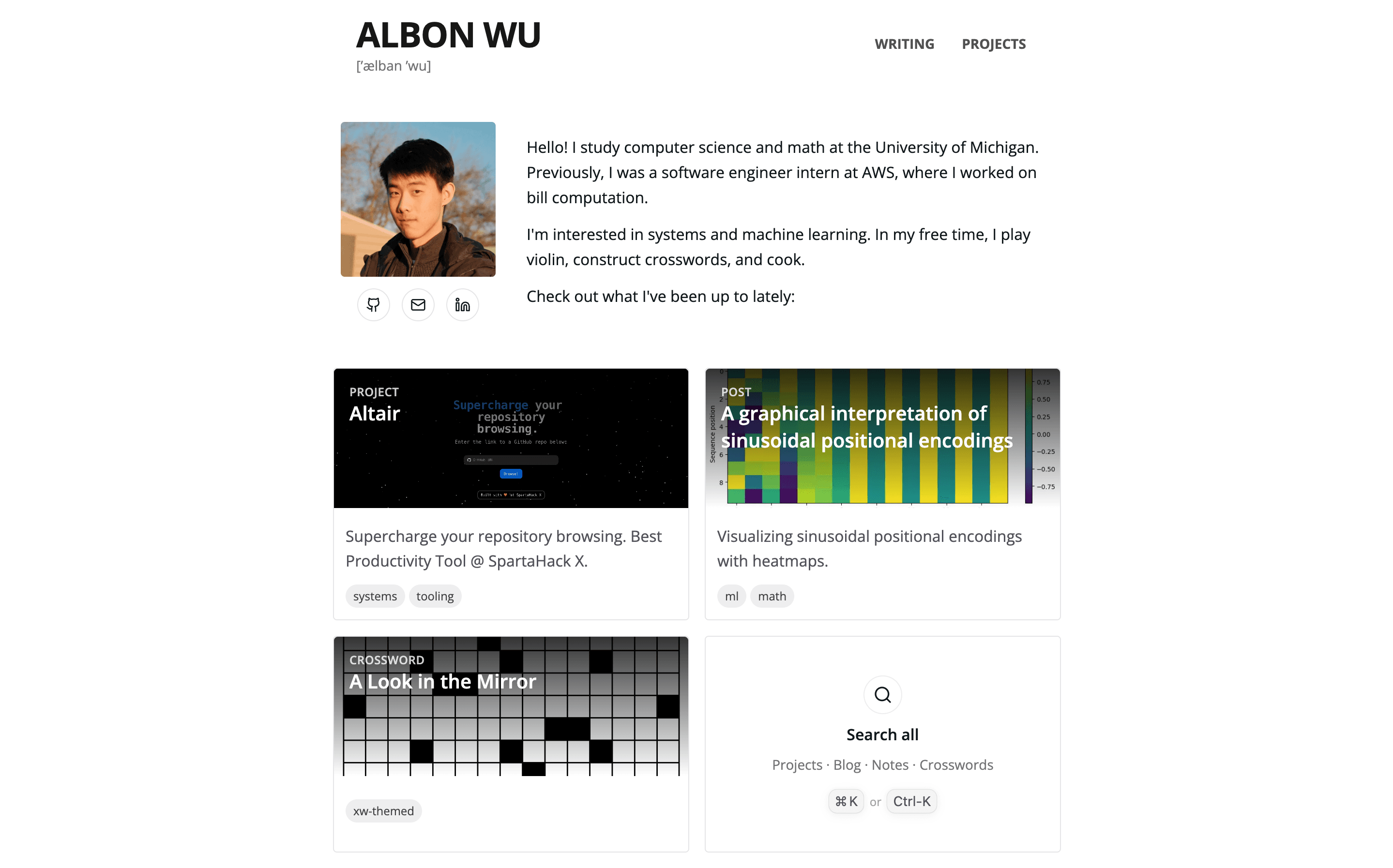 Hello! I study computer science and math at the University of Michigan. Previously, I was a software engineer intern at AWS, where I worked on bill computation.